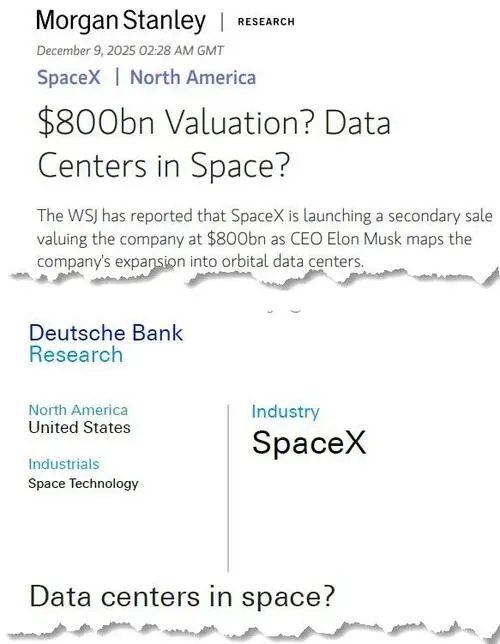财联社12月17日讯(编辑 潇湘)在SpaceX确认有意明年进行首次公开募股(IPO)据称寻求1.5万亿美元估值,以及马斯克强烈支持在太空部署数据中心之后,连华尔街卖方机构也开始深入研究起了这一概念。