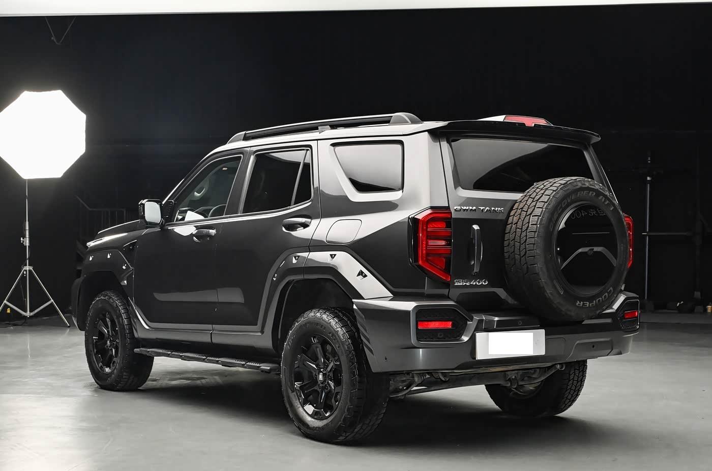 再来看车身侧面部分,新车4985mm车长与2850mm轴距构成标准方盒子造型,风刃腰线从前轮眉贯穿至车尾,配合向外凸出的铆钉轮拱展现肌肉感。车顶行李架与侧裙防擦条采用一体化设计,18英寸熏黑轮毂搭配265/65 R18全地形轮胎,离地间隙达224mm。双侧电动踏板在开启时自动展开,但铆钉装饰件存在轻微剐蹭风险。尺寸方面,新款坦克400长宽高分别为4964/1970/1905毫米,轴距2850毫米,车长相比在售车型缩短21毫米,宽度增加10毫米,高度增加5毫米,轴距保持一致。
